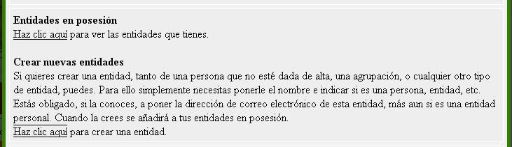 Los demás tipos de entidades (objetos, lugares o personas jurídicas) no tienen tantas restricciones. El mecanismo es más sencillo, si cabe, en estos casos. Este tipo de entidades no están conectadas fuera de la Sociedad Virtual por cuentas de correo electrónico, y por lo tanto, ese campo no se puede indicar. La persona que cree una entidad de alguno de estos otros tipos podrá administrarla por completo, ver el buzón, cambiar permisos, y todas las acciones disponibles depentiendo del tipo de entidad que sea. De forma similar a las entidades de tipo "persona", cualquier otro usuario podrá solicitar la toma de posesión de ésta (con mayores o menores permisos) o traspaso de poderes. Estas solicitudes se podrán realizar, en primera instancia al usuario que la creó, o posteriormente a un responsable de la Sociedad Virtual, donde se procederá a realizar una certificación similar a la indicada para el tipo "persona".