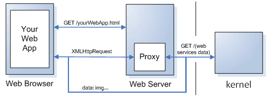 La parte más importante el la división entre la parte 'local' de la aplicación (cliente-servidor) basada en css y javascript; y una parte de peticiones (cliente-proxy-kernel) donde terminan yendo las escrituras, consultas, inicios de sesión y registros. Gracias a la arquitectura del AJAX, no es necesario pasar por el proxy para recepcionar datos como imágenes, vídeos, sonidos, estáticos, y ese tipo de contenido.